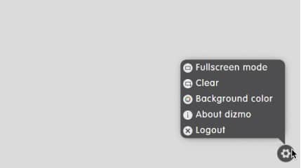 Fullscreen mode: Is expanding the dizmo workspace to a full size view, hiding any attributes from the browser, such as tabs and address bar. To exit the full screen mode, click the Esc button on the keyboard or select fullscreen mode again in the system cogwheel.